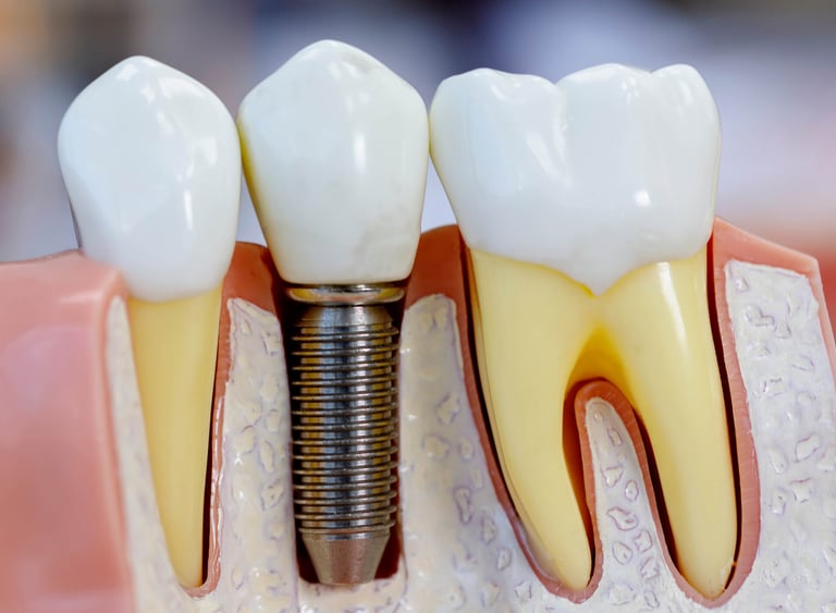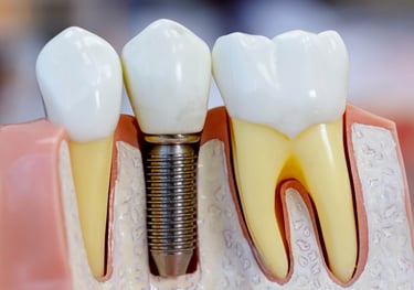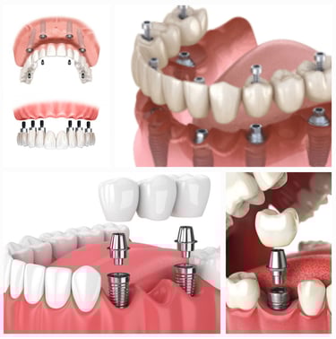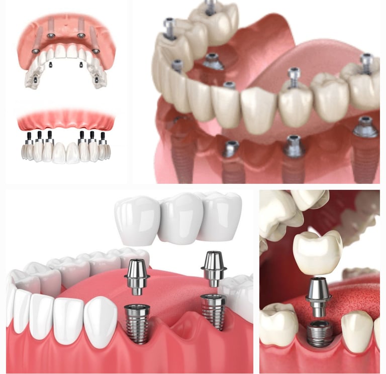 São estruturas de titânio que são cirurgicamente instaladas no osso maxilar ou mandibular substituindo os dentes perdidos. A osseointegração é o processo pelo qual o implante se funde ao osso, garantindo uma base sólida para a futura prótese. Recomendado para quem perdeu um ou mais dentes. Oferecem benefícios como estabilidade, durabilidade, qualidade estética e conforto.
